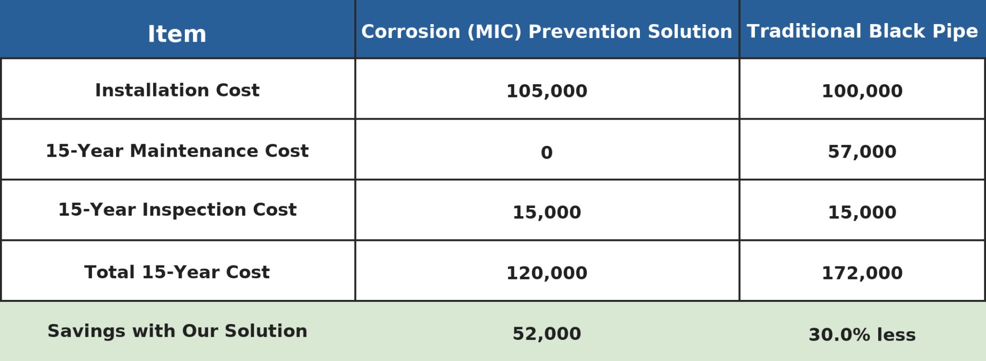 The following is a comparison table of the 15-year total costs of Corrosion Prevention Solution and Traditional Black Pipe in wet sprinkler system.