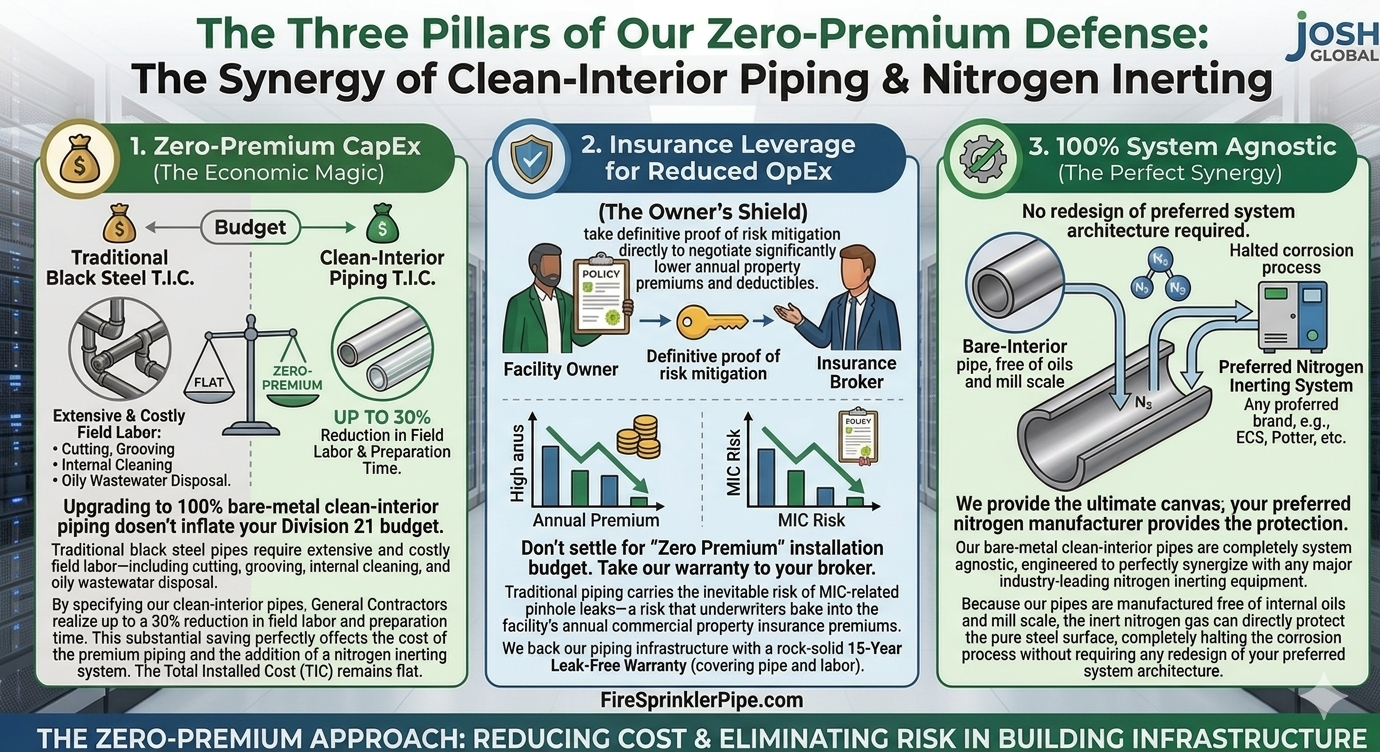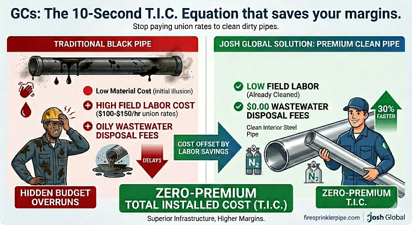 Upgrading to 100% bare-metal clean-interior piping doesn't inflate your Division 21 budget. Traditional black steel pipes require extensive and costly field labor—including cutting, grooving, internal cleaning, and oily wastewater disposal. By specifying our clean-interior pipes, General Contractors realize up to a 30% reduction in field labor and preparation time. This substantial saving perfectly offsets the cost of the premium piping and the addition of a nitrogen inerting system. The Total Installed Cost (TIC) remains flat.