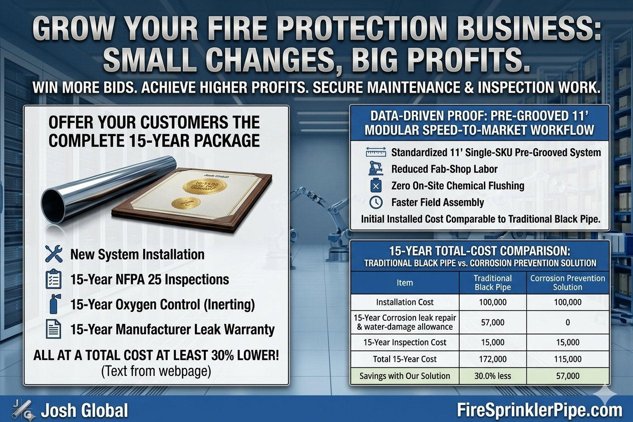 - 15-Year Limited Leak Warranty issued directly to owners: When installed and maintained per program, our pipe in the wet and dry sprinkler system is covered for qualifying leaks caused by internal corrosion (including MIC). We issue a project-specific warranty certificate directly to the building owner, while the fire protection contractor keeps the NFPA 25 and WPNI/DPNI service revenue.