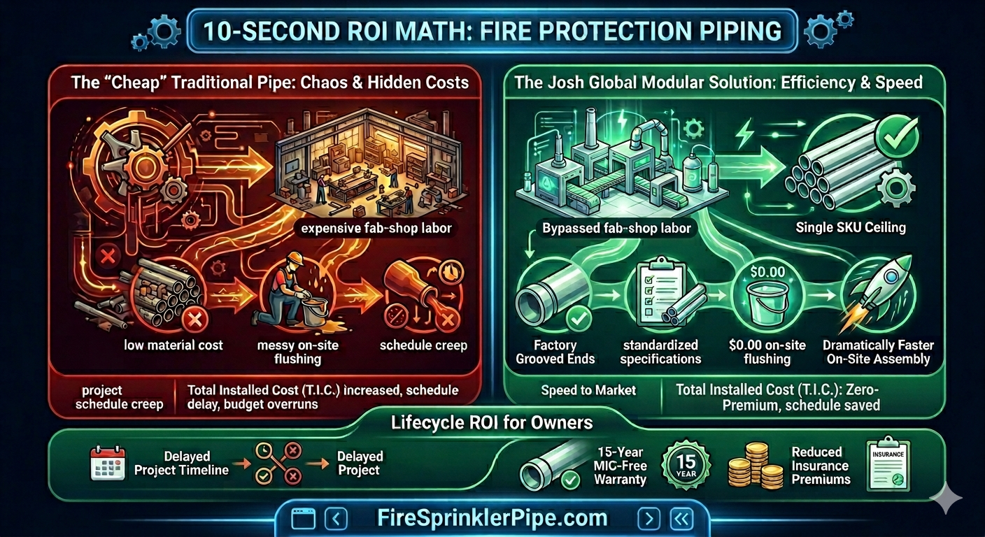 Single-SKU Ceiling (The 100% Modular Grid): Use our exact 11' pipes for BOTH branch lines and cross mains. Pre-grooved at the factory for rapid assembly. Eliminate measuring and cutting on your primary straight runs, reserving field fabrication strictly for complex drops and final tie-ins.